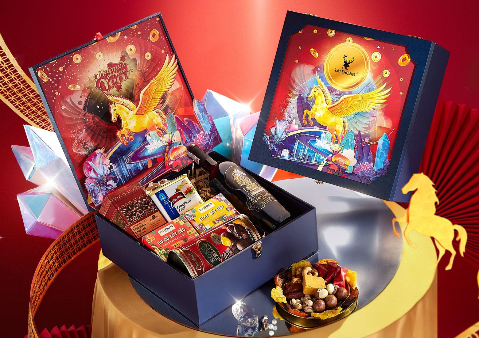Hộp Quà Tết Khải Hoàn tỏa sáng với hình ảnh tuấn mã hoàng kim dũng mãnh và đôi cánh chắp bước cơ hội, lễ hộp Khải Hoàn là biểu tượng của vinh quang và chiến thắng rực rỡ.