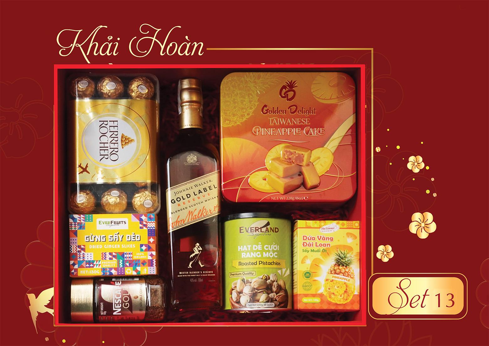 Bánh Quy Dứa Đài Loan Golden Delight | Socola Ferrero Rocher 30 viên | Dứa Vàng Đài Loan Sấy Muối Ớt Viet Essence | Gừng Sấy Dẻo Ever Fruits | Hạt Dẻ Cười Rang Muối Everland | Cà Phê Hòa Tan Nguyên Chất Nescafe Gold | Rượu Whisky Johnnie Walker Gold Label Reserve | Bộ Hộp Và Túi Giấy Khải Hoàn
