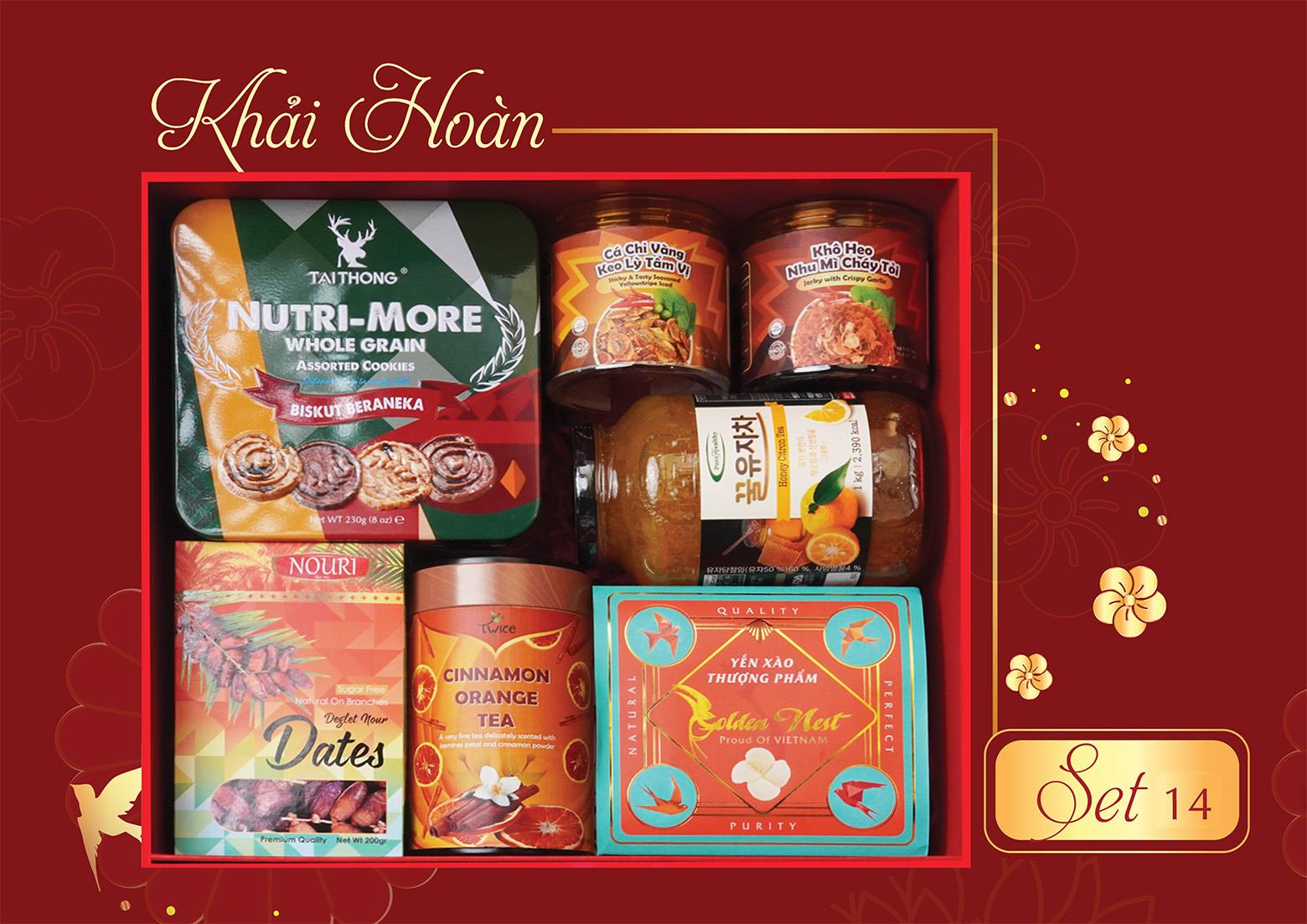 Bánh Quy Yến Mạch Nutri-More | Yến Sào Thượng Phẩm Golden | Chà Là Sấy Dẻo Nouri | Cá Chỉ Vàng Keo Lỳ Tẩm Vị | Trà Cam Quế Hoa Nhài | Cá Đù Giòn Rôm Rốp | Trà Quýt Mật Ong PureHealthy | Bộ Hộp Và Túi Giấy Khải Hoàn