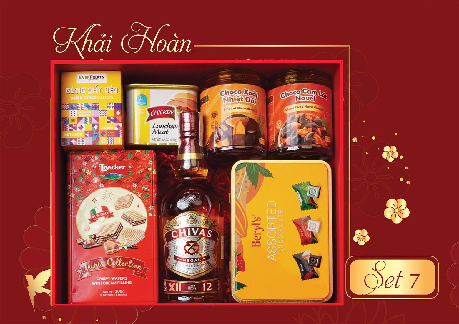 Bánh Xốp Loacker Minis Collection | Socola Beryl’s Snow Flower Assorted | Gừng Sấy Dẻo Ever Fruits | Thịt Gà Hộp Nguyên Vị Luncheon Meat Bristol | Choco Cam Lát Navel | Choco Xoài Nhiệt Đới Everland | Rượu Chivas Regal 12 | Bộ Hộp Và Túi Giấy Khải Hoàn