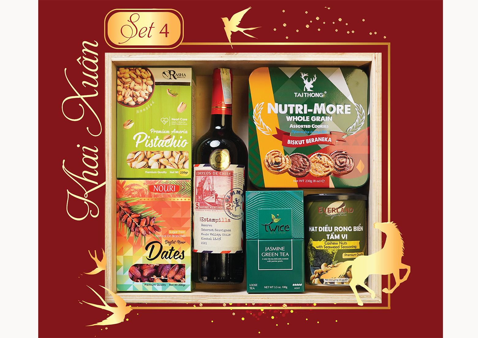 Bánh Quy Yến Mạch Nutri-More | Chà Là Sấy Dẻo Nouri | Trà Lài Twice Cao Cấp (Hộp Vuông Premium) | Hạt Điều Tẩm Vị Rong Biển Everland | Hạt Dẻ Rang Mộc Everland | Rượu Vang Đỏ SANTA ESTAMPILLA, Reserva Cabernet Sauvignon | Bộ Hộp Và Túi Giấy Khai Xuân