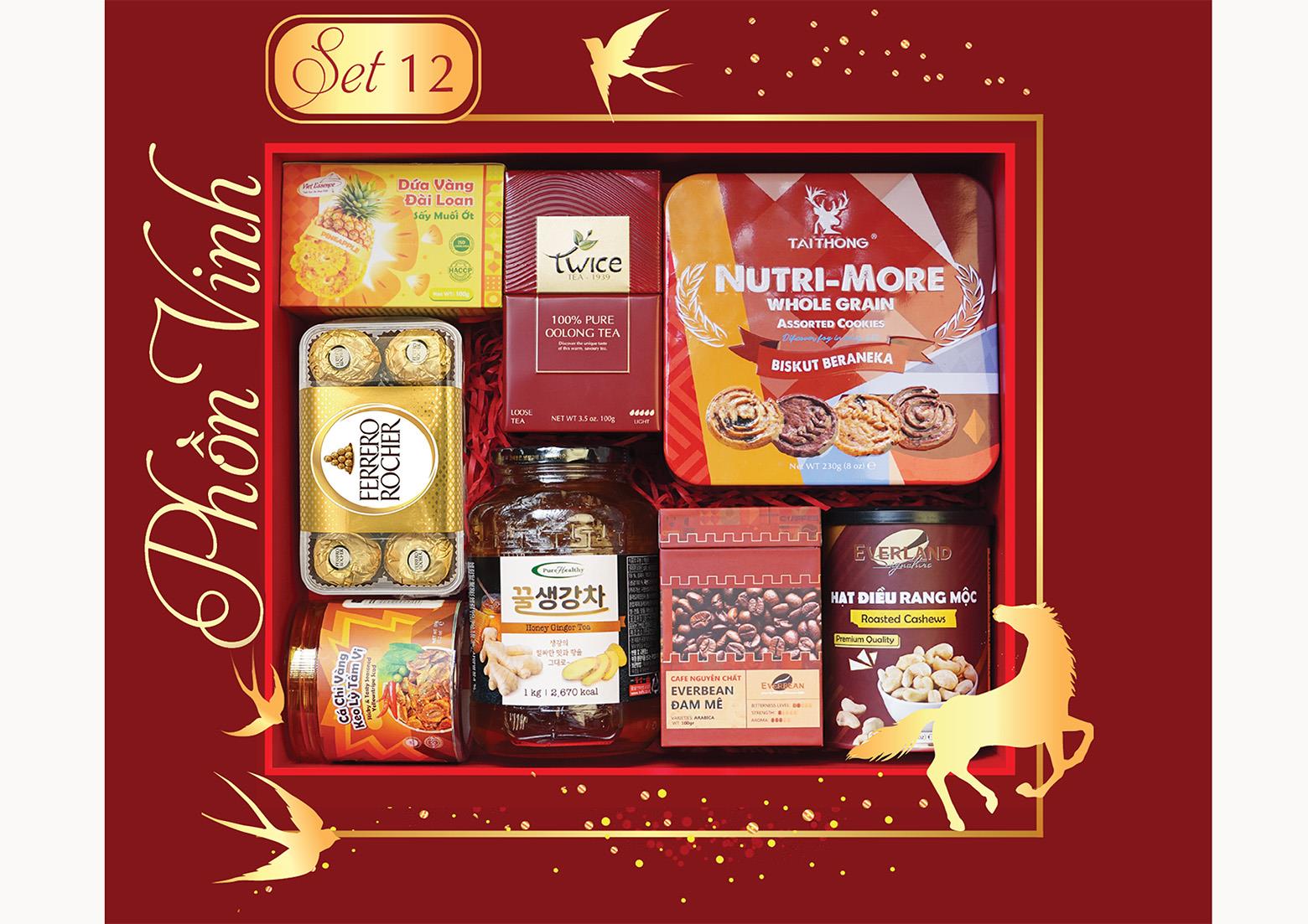 Dứa Vàng Đài Loan Sấy Muối Ớt Viet Essence | Socola Ferrero Rocher | Bánh Quy Yến Mạch Nutri-More | Cá Chỉ Vàng Keo Lỳ Tẩm Vị | Trà Gừng Mật Ong PureHealthy | Cafe Nguyên Chất Everbean Đam Mê | Hạt Điều Rang Muối Everland (Vỏ lụa) | Trà Lài Twice Cao Cấp (Hộp Vuông Premium) | Bộ Hộp Và Túi Giấy Phồn Vinh